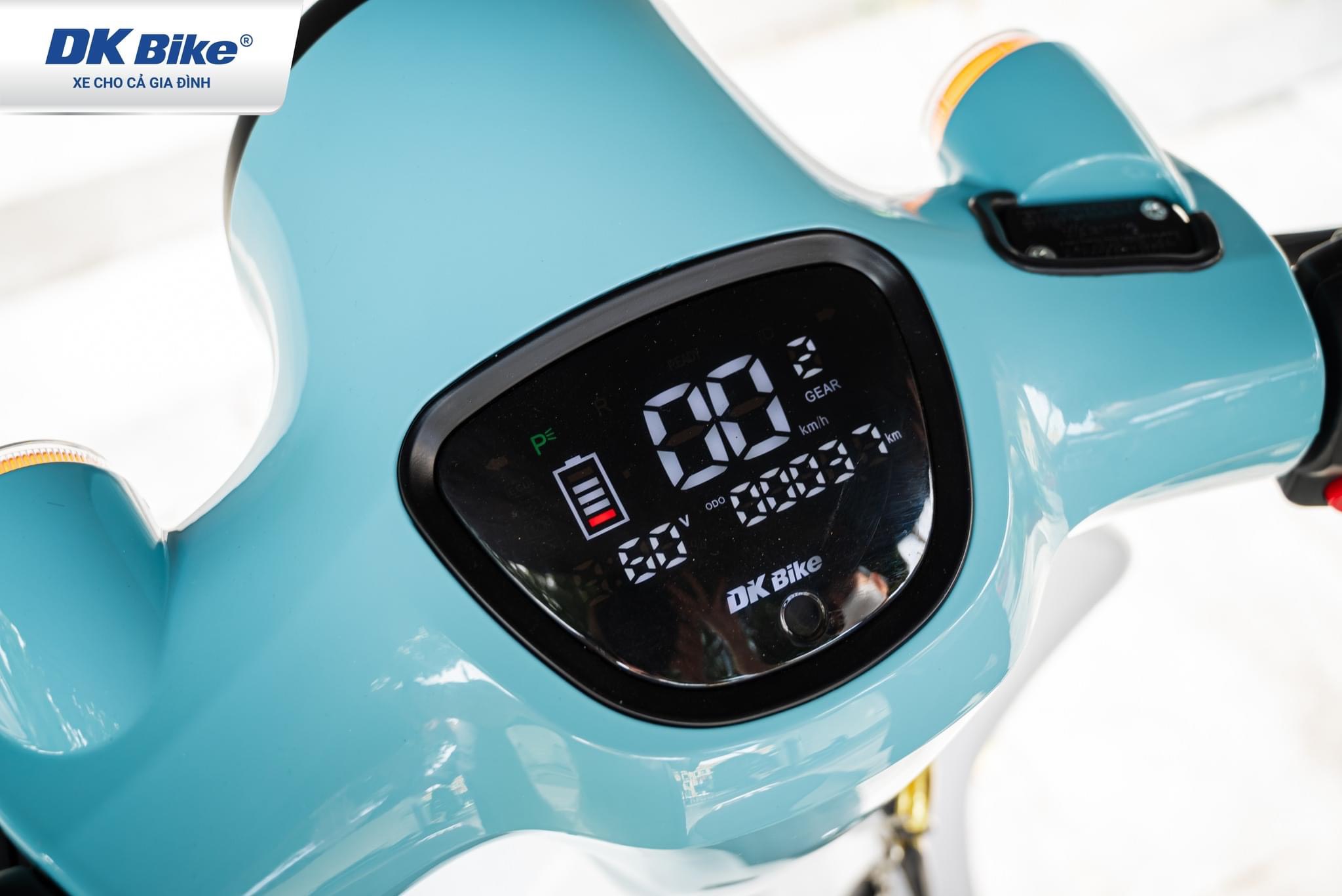 Xe máy điện DK Crea Mono được trang bị đồng hồ full LED tràn viền cực kì sắc nét. Bạn có thể dễ dàng quan sát các thông số cần thiết như tốc độ, báo xăng, quãng đường, xi nhan và hệ thống đèn báo,...