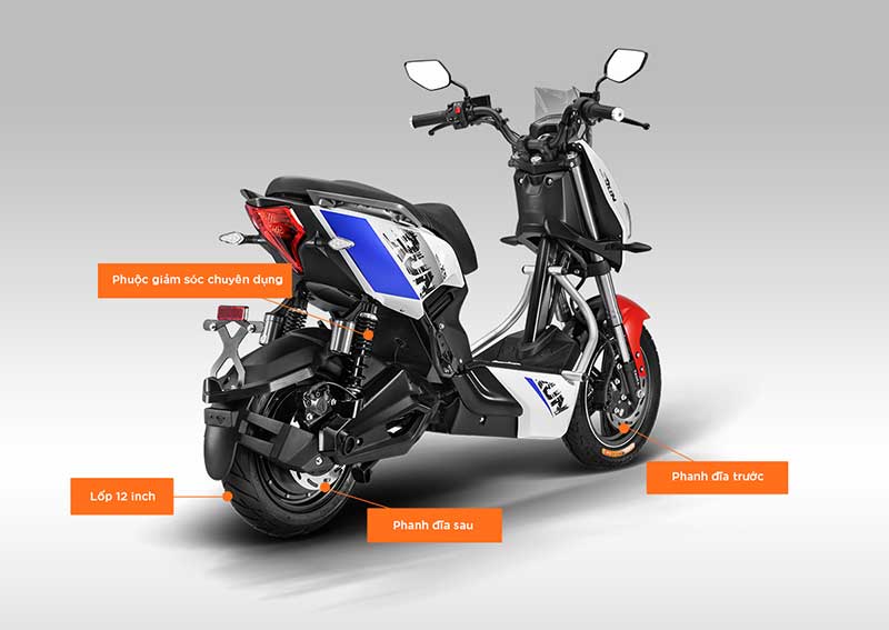 Với hệ thống giảm xóc cao cấp dành riêng cho các dòng xe thể thao, bao gồm phuộc hành trình ngược ở phía trước và phuộc hơi phía sau. YADEA X5 có khả năng biến những cung đường đầy thử thách, nhiều xóc nảy trở nên êm ái và an toàn hơn. Hệ thống phanh đĩa lớn 220mm ở cả 2 phía trước – sau với má phanh đôi gia tăng độ an toàn cho người sử dụng. Kể cả khi đang chạy xe với tốc độ cao, người dùng cũng có thể dễ dàng phanh xe một cách nhanh chóng và trơn tru.