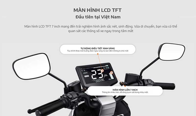 YADEA G5 sở hữu màn hình LCD kích thước lên đến 7 inch, cảm biến tự động điều chỉnh ánh sáng, màn hình sẽ không bị mờ khi đi dưới trời nắng. Với kích thước lớn, màn hình của G5 hiển thị đầy đủ các thông tin cần thiết như tốc độ, quãng đường đã đi, chế độ lái, lượng pin.