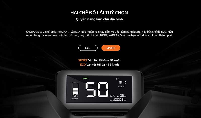 YADEA G5 có 2 chế độ lái là Eco và Power, hỗ trợ tốt cho người dùng ở các mục đích sử dụng khác nhau. Chế độ Eco giúp xe tiết kiệm năng lượng, giúp xe tối ưu được quãng đường di chuyển xa nhất, lúc này vận tốc đạt được tối đa 38 km/h. Trong khi đó, chế độ Power cho xe bức tốc sức mạnh lớn hơn giúp xe có thể đạt tốc độ tối đa 50 km/h.