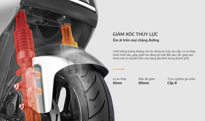 Hệ thống giảm xóc trước và sau hoạt động khá êm ái, với chất liệu lò xo thép giúp giảm tác động từ mặt đất siêu tốt, giúp bạn thoải mái di chuyển trên mọi địa hình trong thành phố.